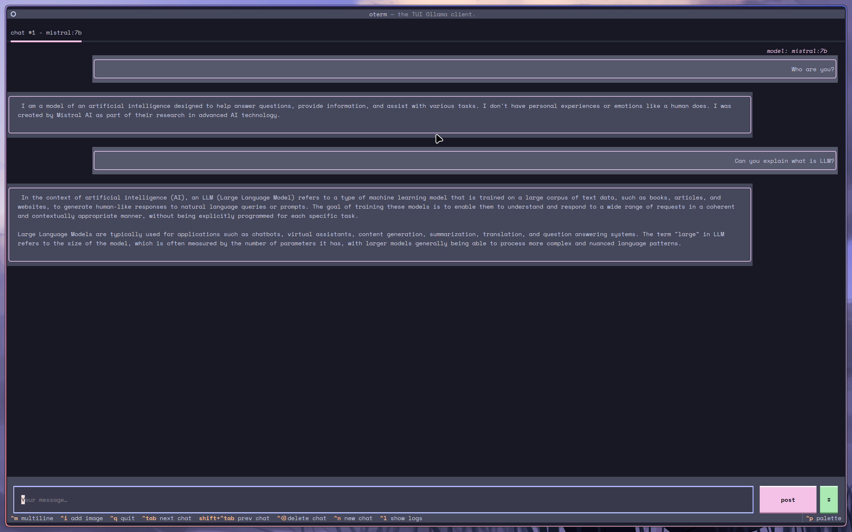 I grabbed the Ollama client oterm to interact with it, and it looks something like this: