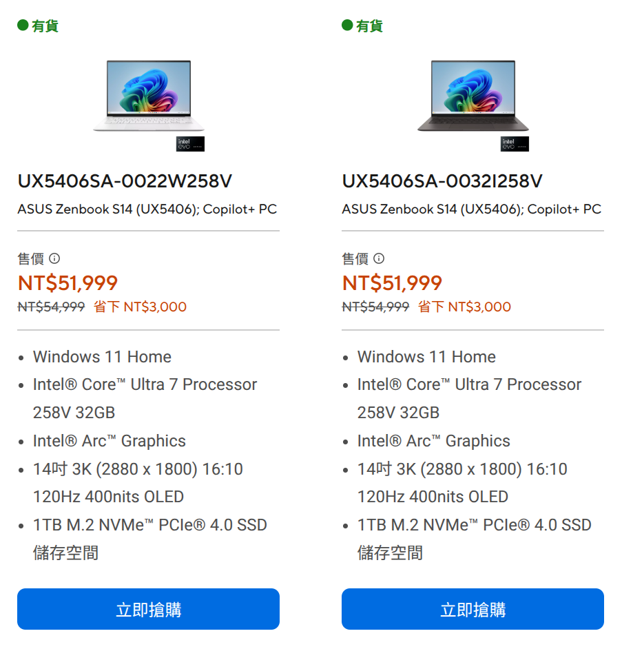 Image shows the price of Zenbook S14 at the price of 51,999 TWD